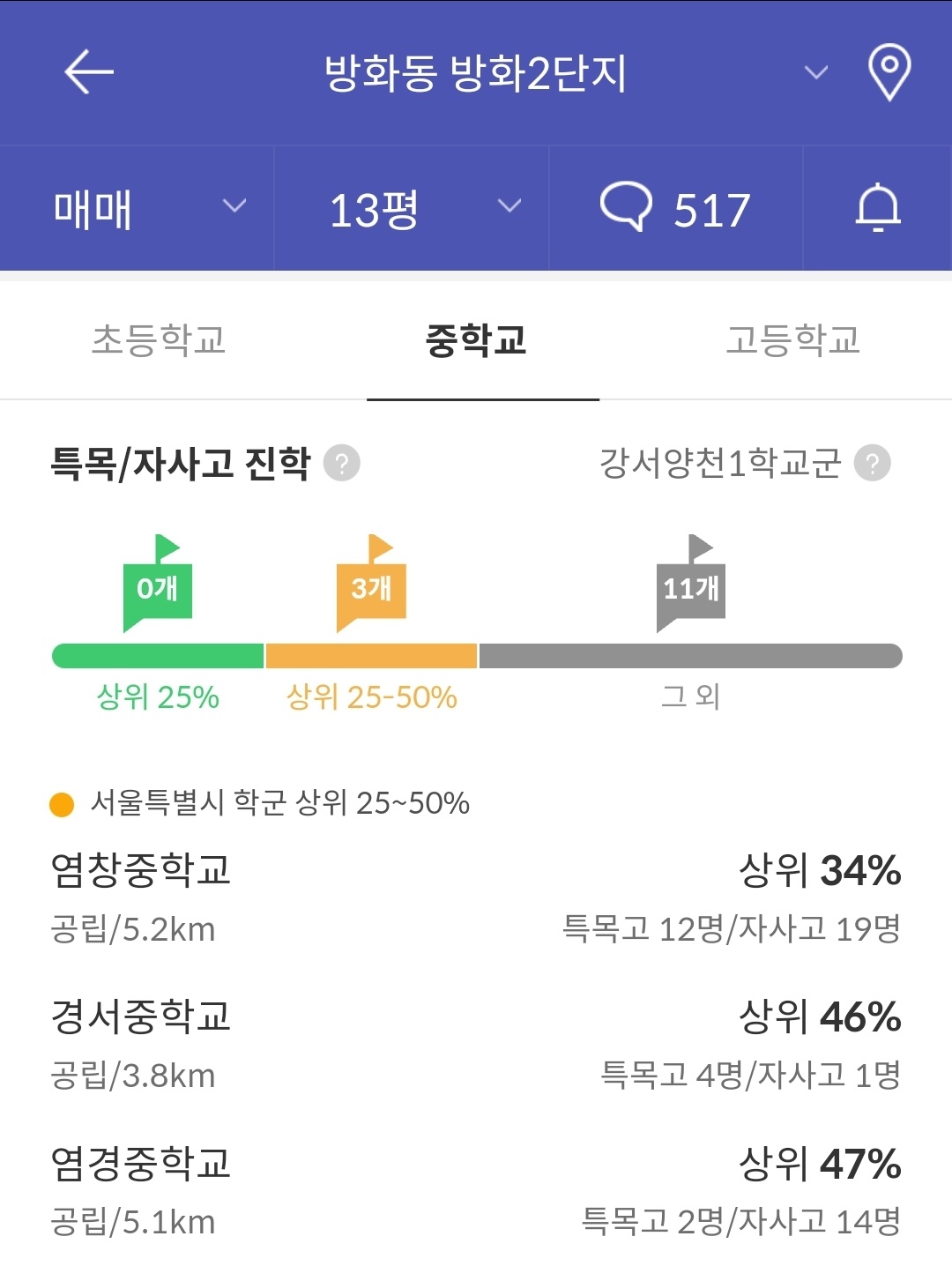 배정중학교는 위와 같은데 1위는 명덕여중으로 강서구에서 유일하게 학업성취도 90%가 넘는다. 그럼 남자 애들은 무조건 90%미만인 학교를 가겠구나. 도시개발2단지에서 배정받는 학교는 마곡중학교로 강서구에서 15위.