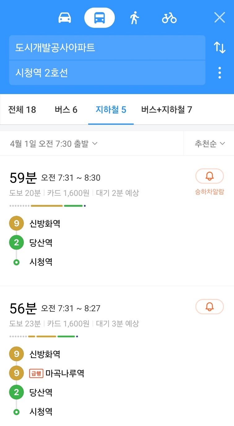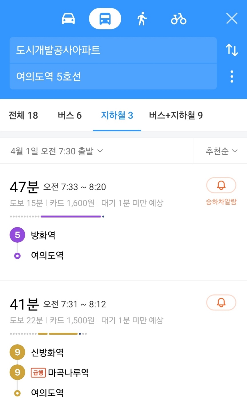 영상에 나온 3가지 아파트 단지 중 강서구 방화동의 도시개발2단지를 기준으로 강남역, 여의도역, 시청역에 얼마나 빨리 도달할 수 있는지 확인해 보았다.