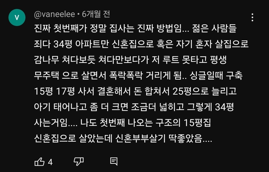 맞아요 맞아. 내 친구들도 10평대에서 전세로 시작해서 돈 모아서 집 사거 + 넓혀 가고 그랬다.