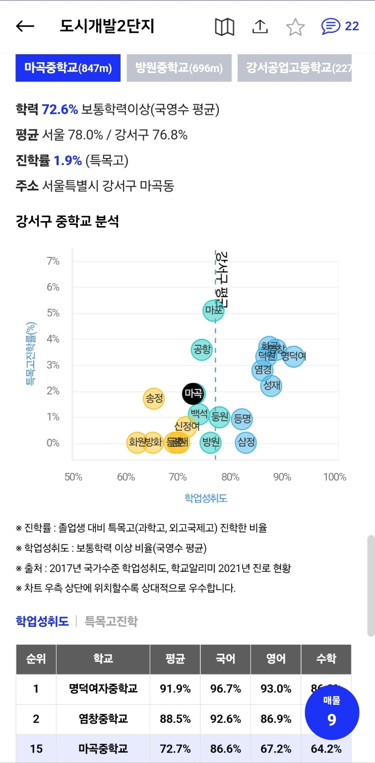 배정중학교는 위와 같은데 1위는 명덕여중으로 강서구에서 유일하게 학업성취도 90%가 넘는다. 그럼 남자 애들은 무조건 90%미만인 학교를 가겠구나. 도시개발2단지에서 배정받는 학교는 마곡중학교로 강서구에서 15위.