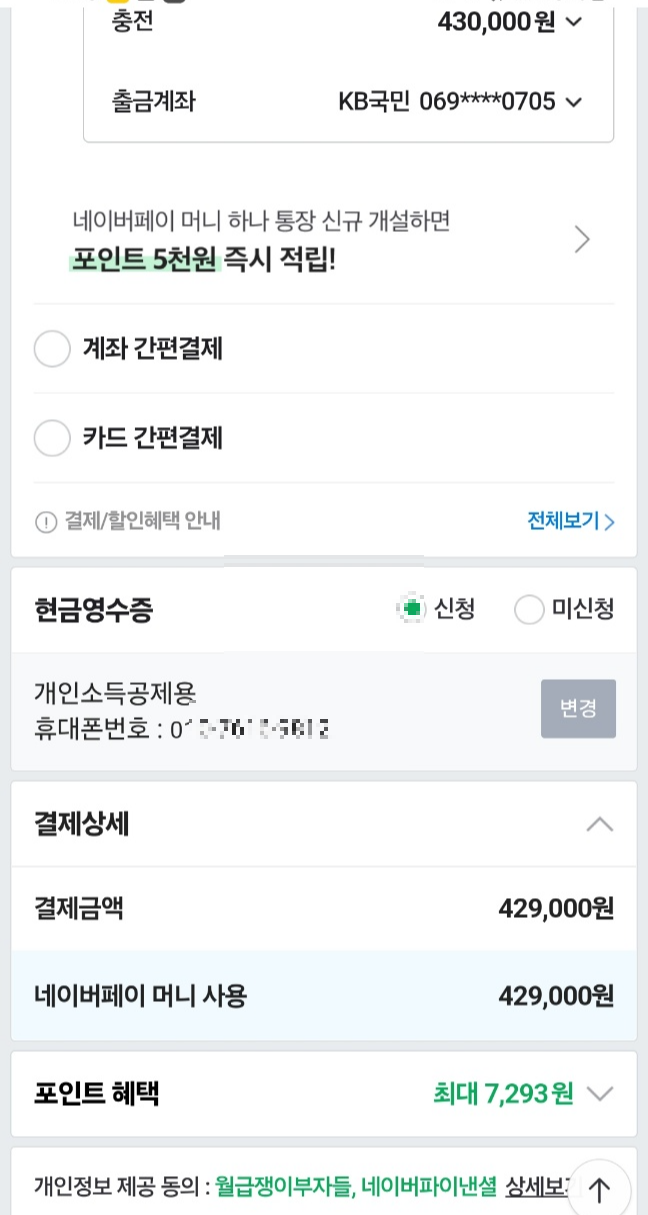 결제 수단은 신용/체크카드, 카카오페이, 토스페이, 네이버페이 등으로 할 수 있습니다. 저는 네이버페이 선택 후, 네이버페이에 연결된 계좌에 43만 원을 충전하여 결제했어요. 네이버페이 충전 후 결제를 하면 포인트가 많이 적립되어 좋습니다.