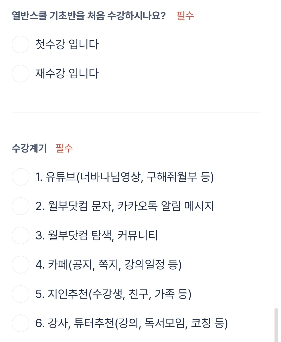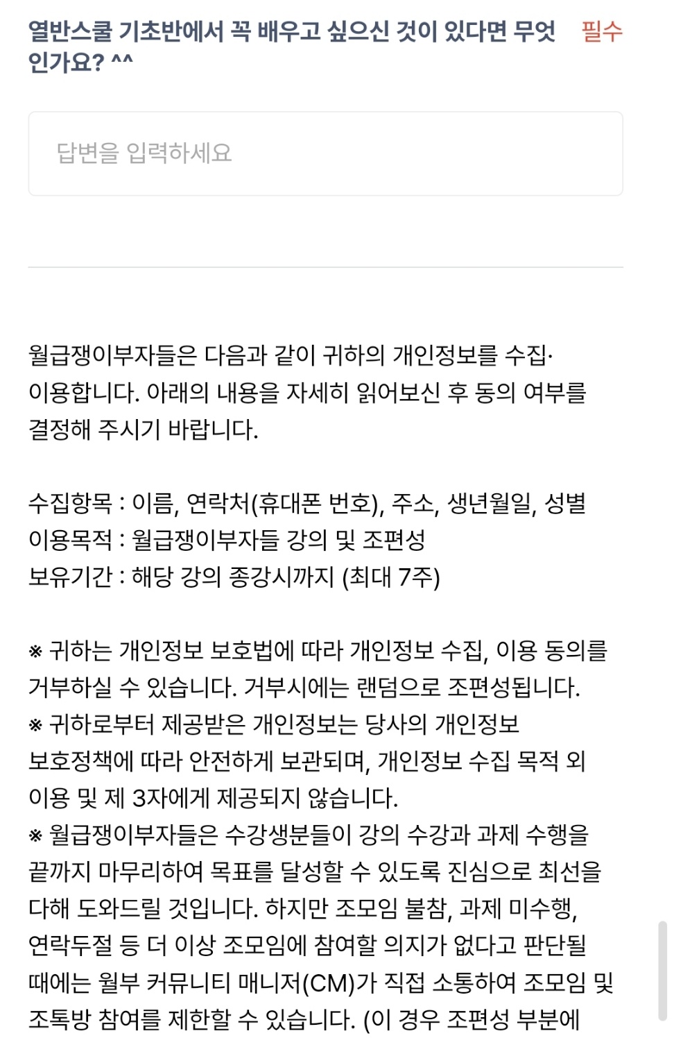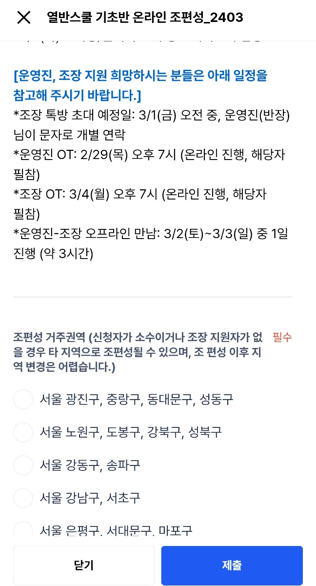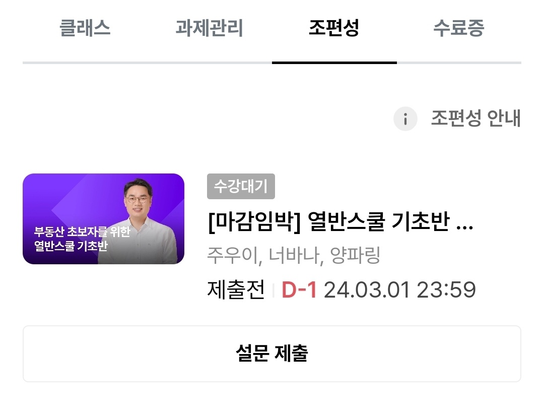 아래는 조편성이 되기 전, 제출해야 할 설문지예요. 열반스쿨 기초반 강의 후, 조편성이 있으니 설문 제출하라고 알람이 오더라고요. 2월 29일 결제 시작한 강의인데 조편성 설문 제출 기한은 3월 1일까지였습니다.