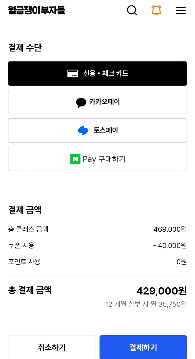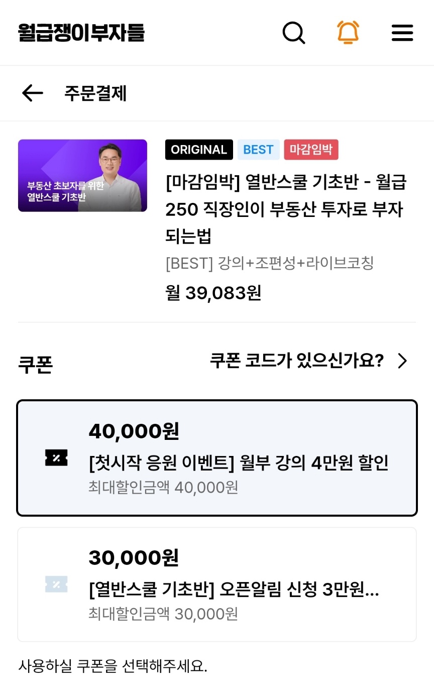 월급쟁이 부자들의 <열반스쿨 기초반>은 419,000원입니다. 여기에 조편성+라이브 코칭까지 더하면 5만 원이 추가되어 469,000원입니다. 그러나 저는 가입 후 '첫 시작 응원 이벤트'로 4만 원 할인 쿠폰을 받아서 그걸 적용했어요. 열반스쿨 기초반 자체의 쿠폰은 3만 원짜리인데, 첫시작 응원 쿠폰은 4만 원이라 이걸로 적용했습니다.