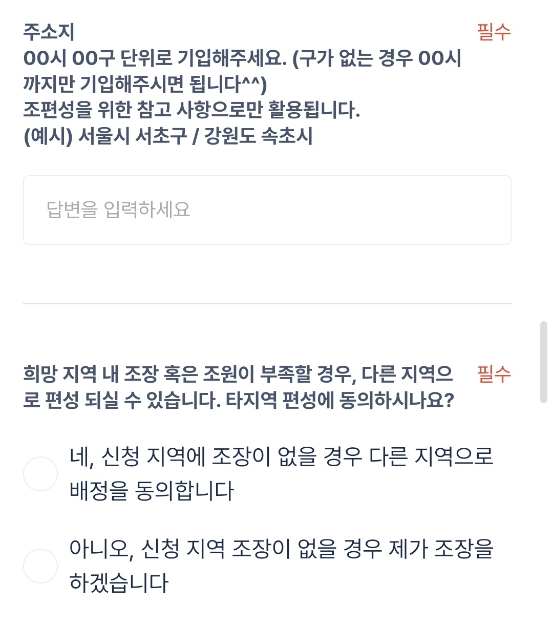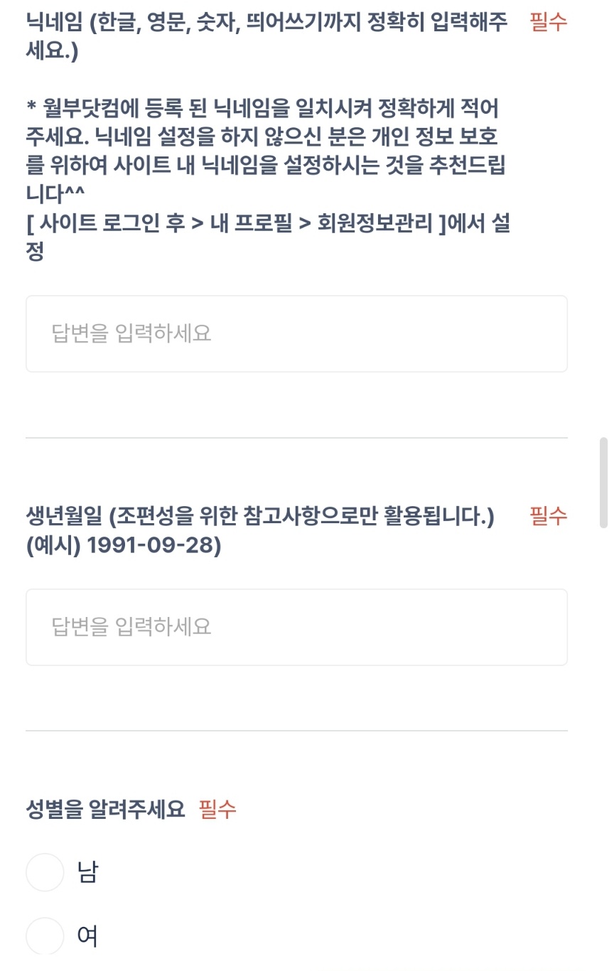 상세 주소를 구나 시 단위까지 기입하고 닉네임도 적어요. 닉네임도 많이 고민했습니다.