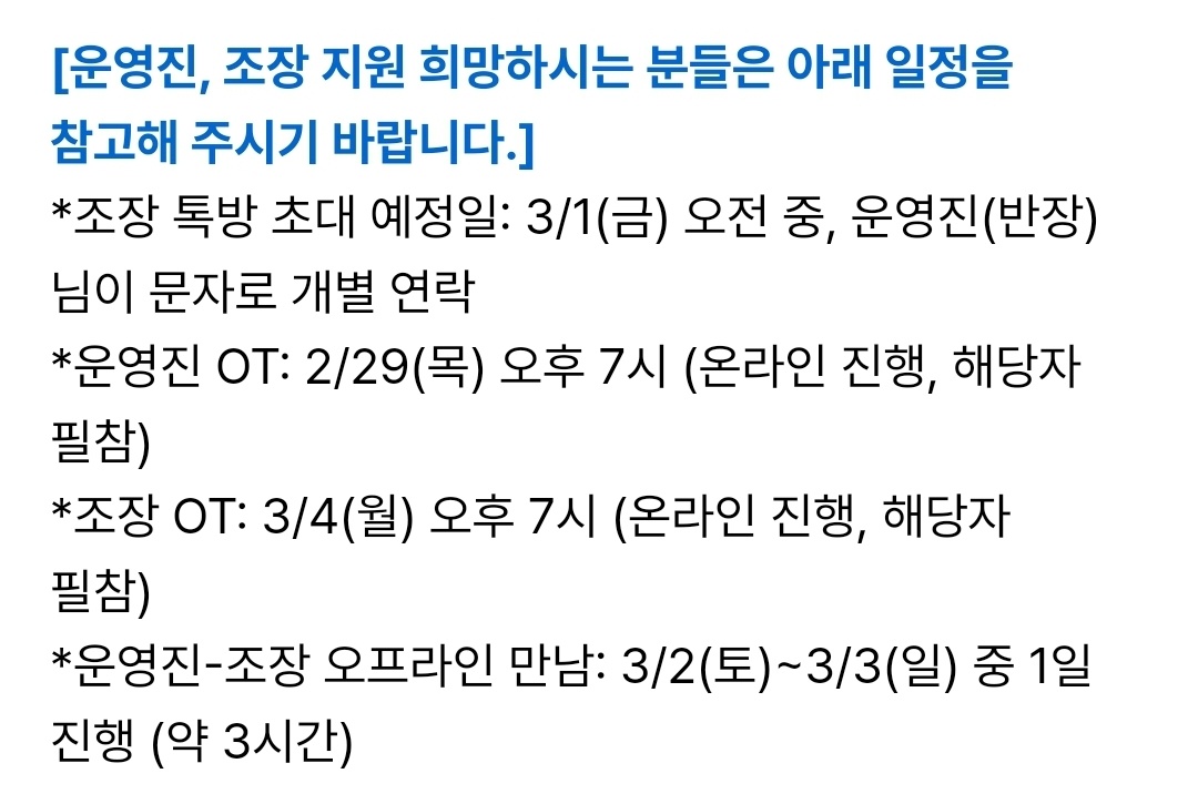 운영진이나 조장을 뽑나 봐요. 지원자를 받네요.