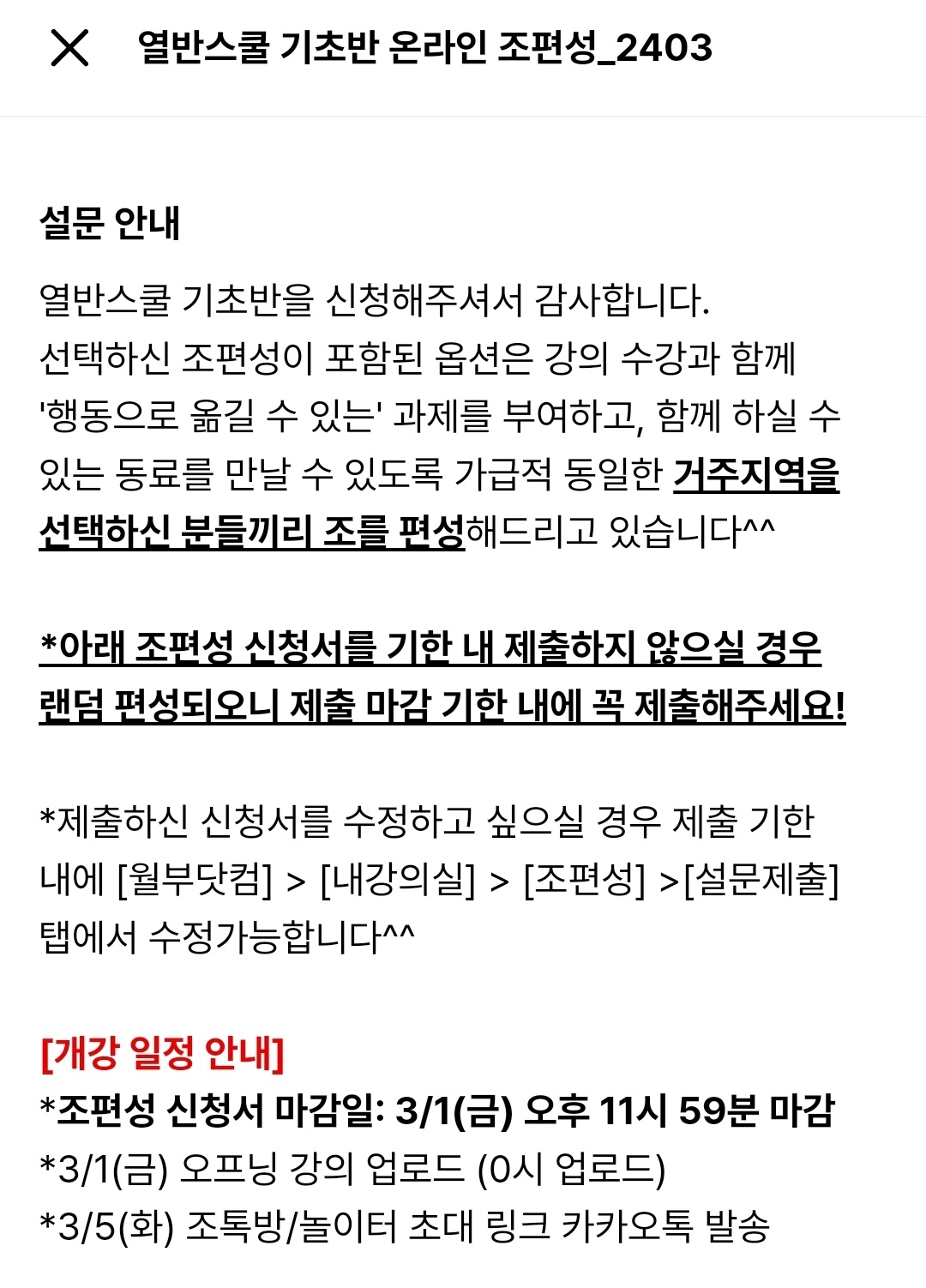 아래는 조편성이 되기 전, 제출해야 할 설문지예요. 열반스쿨 기초반 강의 후, 조편성이 있으니 설문 제출하라고 알람이 오더라고요. 2월 29일 결제 시작한 강의인데 조편성 설문 제출 기한은 3월 1일까지였습니다.