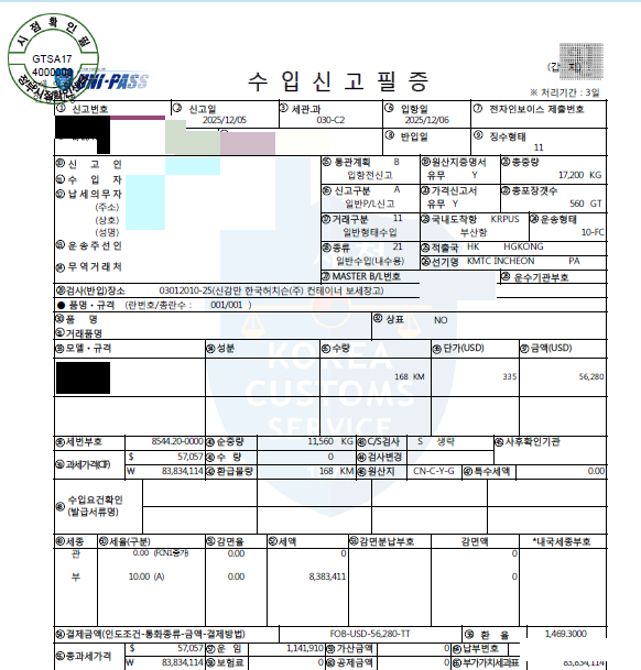 이용하는 관세사를 통하여 수출신고필증(보통 면장이라고 합니다)을 발급받습니다. 쉬퍼로부터 CIPL을 입수하면, 그걸 관세사에게 넘겨 수출신고필증을 발급받습니다. 이때 수출신고 대행 수수료가 발생하니 수수료 요율과 MINIMUM/MAXIMUM 금액을 확인합니다.
