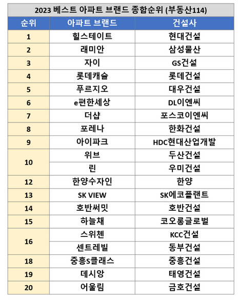 2023 베스트 아파트 브랜드 종합순위 (부동산 114)